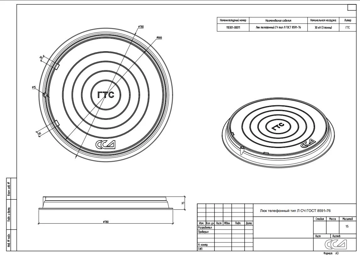 Люки отливаются из серого чугуна марки не ниже СЧ-10 и изготавливаются согласно ГОСТ 8591-76 — «люки для кабельных колодцев телефонной канализации». Дополнительная информация о люках и их маркировке приведена в описании группы.