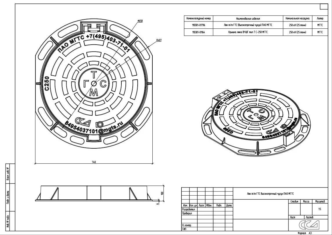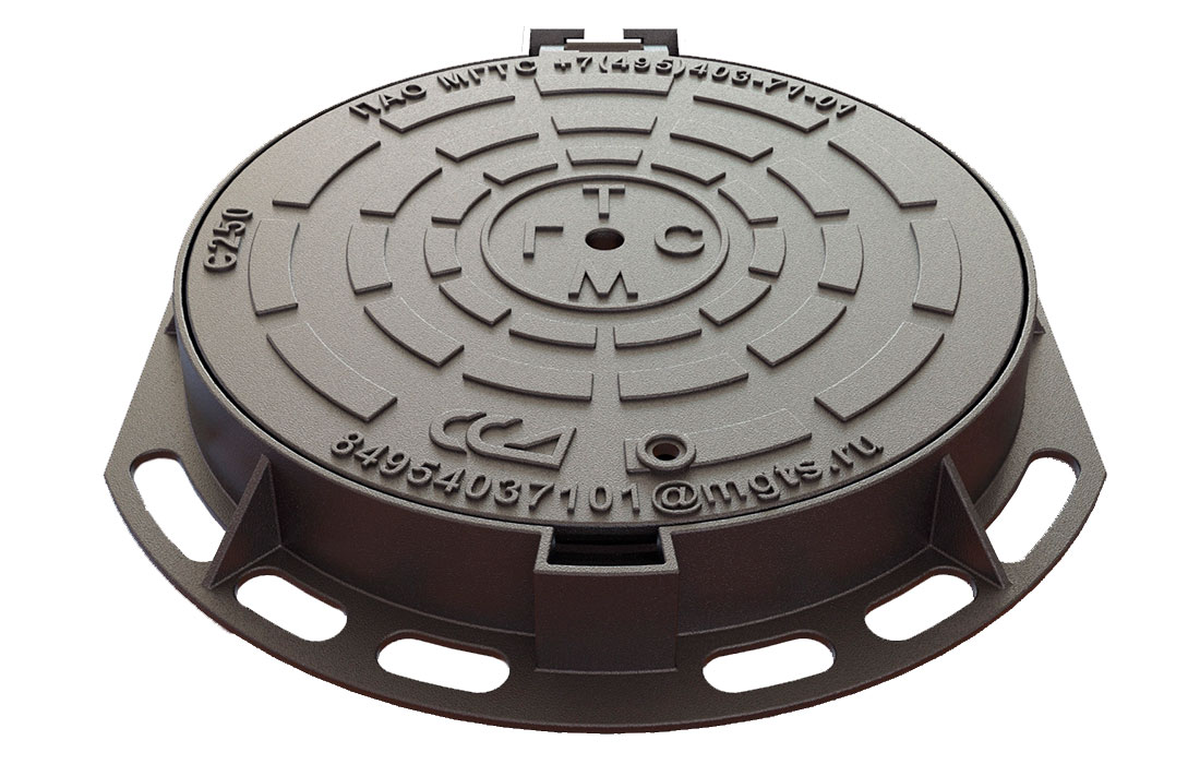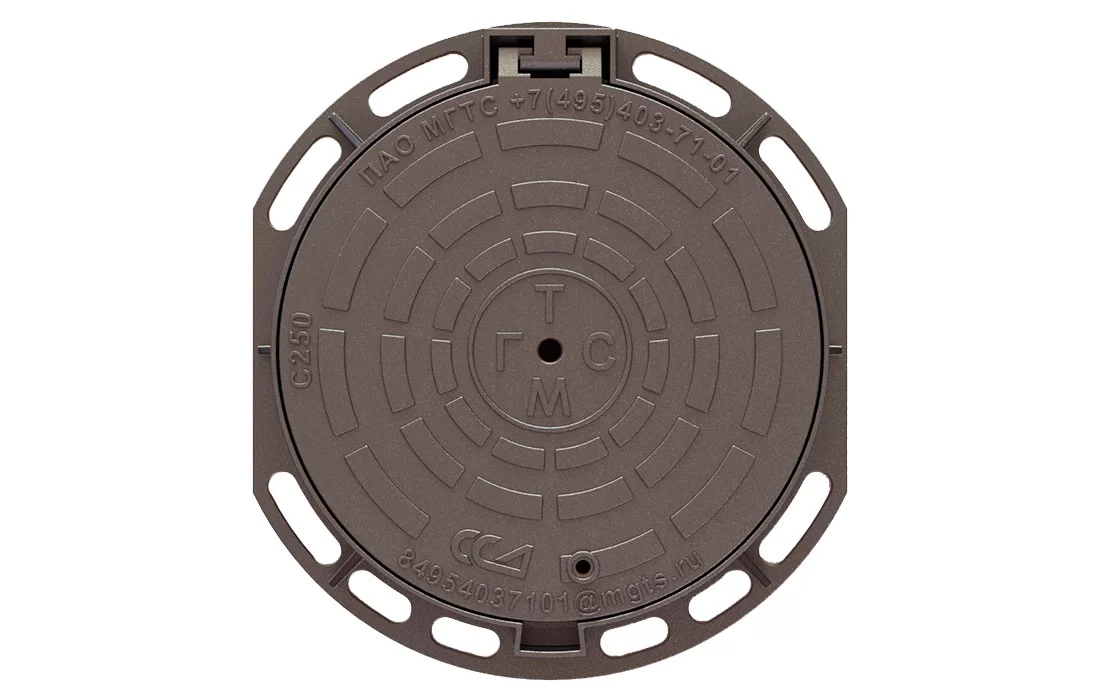 На нерифлёной части наружной стороны верхней крышки люка отлиты буквы "ПАО МГТС", телефонный номер "+7 (495) 403-71-01" и адрес электронной почты "84954037101@mgts.ru".