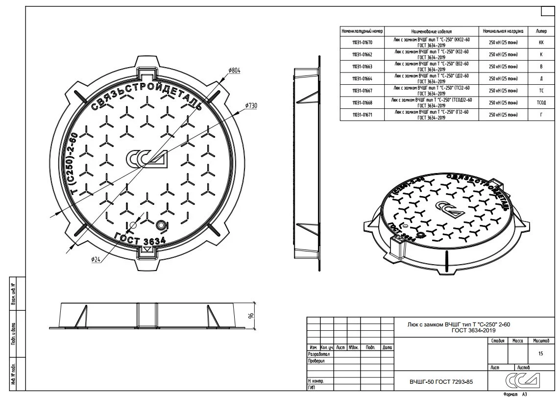 Люки отливаются из чугуна марки «ВЧ-50» согласно EN - GJS-500-7 и изготавливаются согласно ГОСТ 3634 — «Люки смотровых колодцев и дождеприемники ливнесточных колодцев (европейский стандарт EN 124-1994)». Дополнительная информация о люках и их маркировке приведена в описании группы.