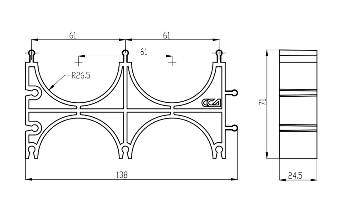 Кластер представляет собой решетчатое изделие с ложементами для укладки труб, выполненное из пластика. На корпусе кластера имеются специальные выступы и пазы для соединения нескольких кластеров в единый блок при прокладке большего количества каналов.