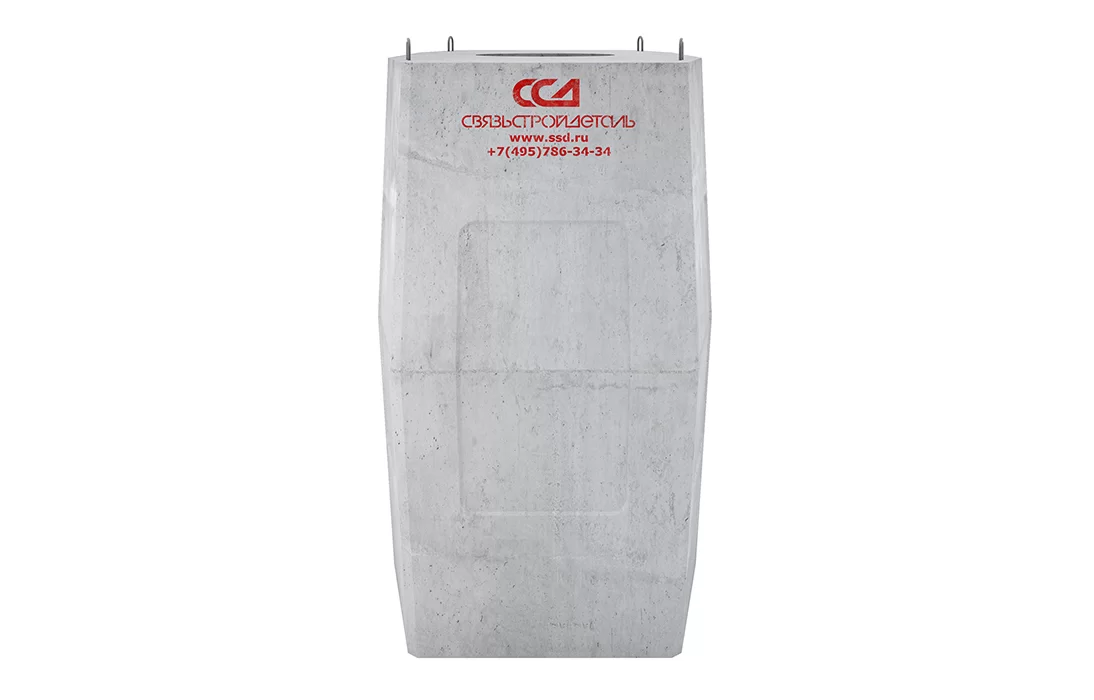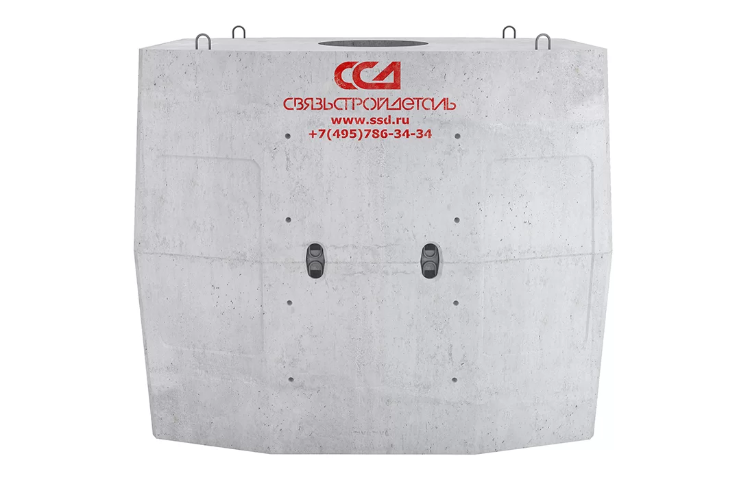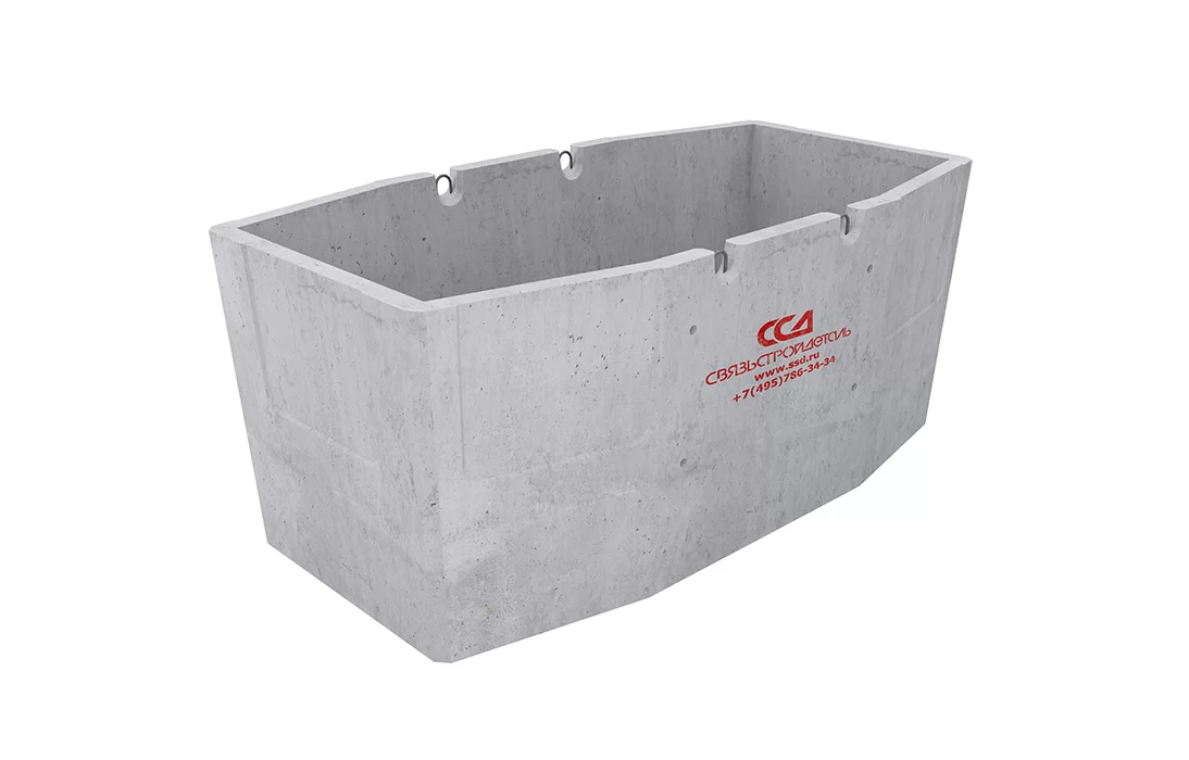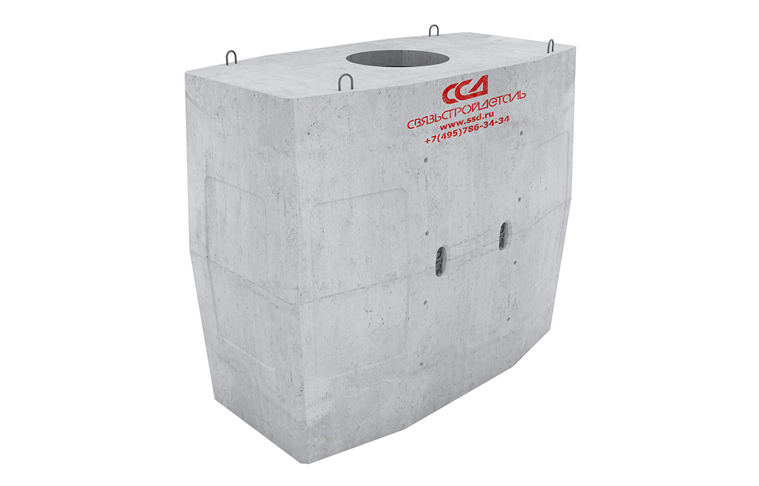 Колодец имеет в сечении восьмиугольную форму и состоит из двух элементов – верхней и нижней половин. Перекрытие верхнего элемента дополнительно армировано и содержит круглое отверстие диаметром 600 мм для формирования горловины с люков. В основании корпуса колодца с внутренней стороны расположена прямоугольная ниша. При необходимости, ее стенку вырезают для создания дренажа. На наружных поверхностях торцевых и боковых стен расположены глухие ниши, в пределах которых монтируются муфты ССД-Пайп (количество и диаметр труб определяется согласно опросному листу). На торцевых поверхностях корпуса колодца имеются петли для строповки при его погрузке и разгрузке с автомобиля, а также для опускания в котлован.