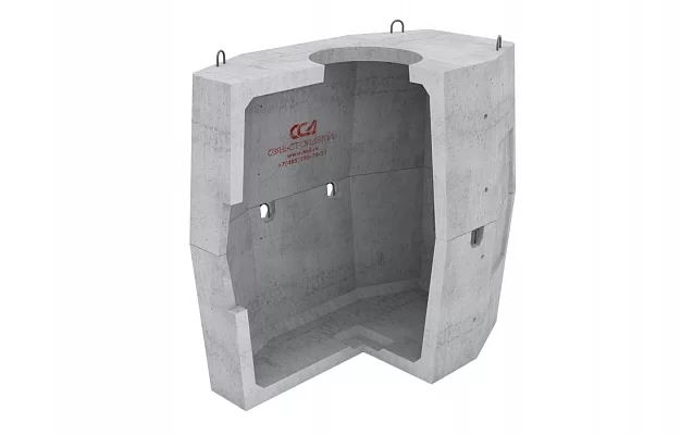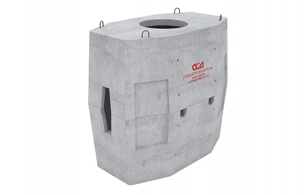 Колодец имеет в сечении восьмиугольную форму и состоит из двух элементов – верхней и нижней половин. На элементах колодца имеются петли для строповки при погрузке и разгрузке их с автомобиля, а также для опускания в котлован. Перекрытие верхнего элемента дополнительно армировано и содержит круглое отверстие диаметром 600 мм для формирования горловины с люком. В основании нижней половины колодца с внутренней стороны расположена прямоугольная ниша. При необходимости, ее стенку вырезают для создания дренажа. На внутренних поверхностях торцевых стенок элементов колодца имеются ниши. В центре ниш расположены технологические отверстия для ввода двух труб с внутренним диаметром 100 мм. Для ввода и вывода каналов на наружных поверхностях боковых стенок колодца расположены по две ниши, с каждой из сторон.