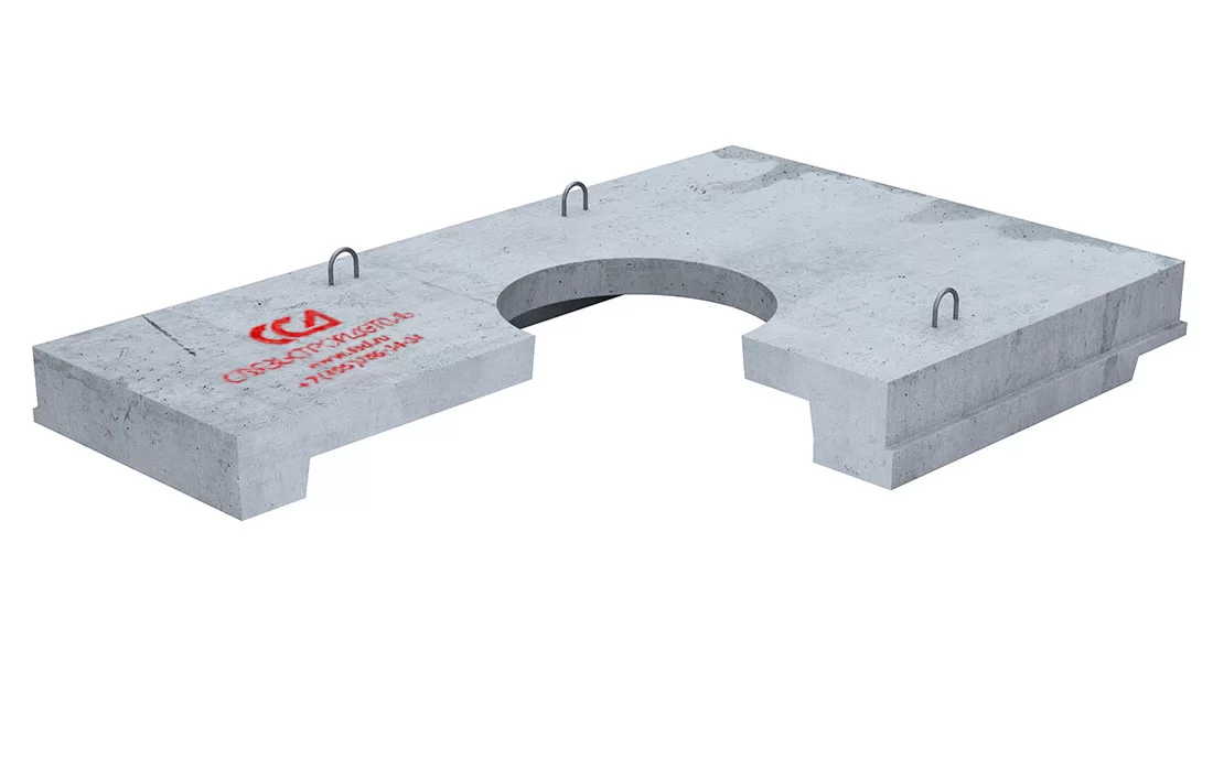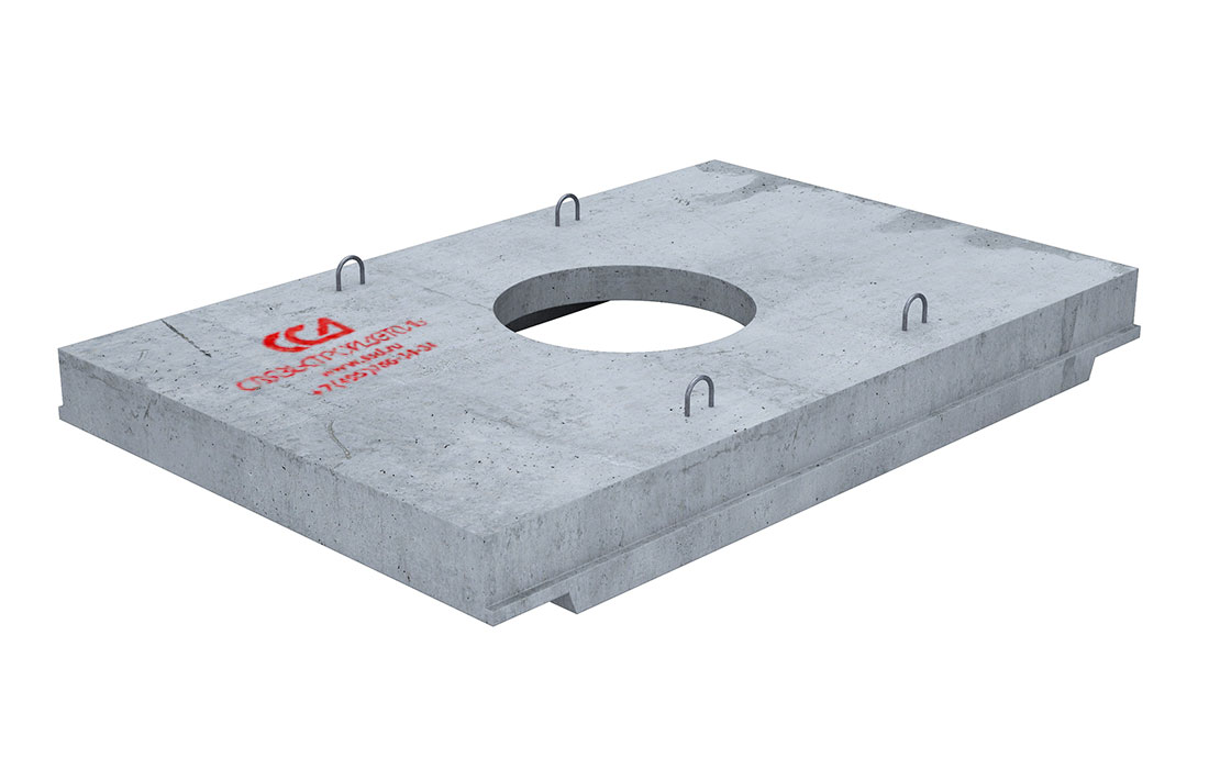 Представляет собой прямоугольную плиту покрытия с выступами на нижней и боковых поверхностях и с отверстием для люка, которая устанавливается на стеновые блоки. Выступ на нижней поверхности плиты находится ниже уровня верхних поверхностей стеновых блоков, что обеспечивает необходимую степень прочности смонтированного колодца. После установки плиты выступы на ее боковых поверхностях образуют пазы, которые заполняются бетоном. Отверстие имеет круглую форму и располагается по центру плиты. На верхней грани плиты имеются четыре петли, обеспечивающие возможность строповки плиты при её погрузке-разгрузке и при опускании плиты на смонтированный корпус колодца. Плита покрытия рассчитана на нормативную нагрузку НК-80. Для идентификации производителя изделия, на внутренней поверхности плиты, в бетоне, отлит логотип ССД.